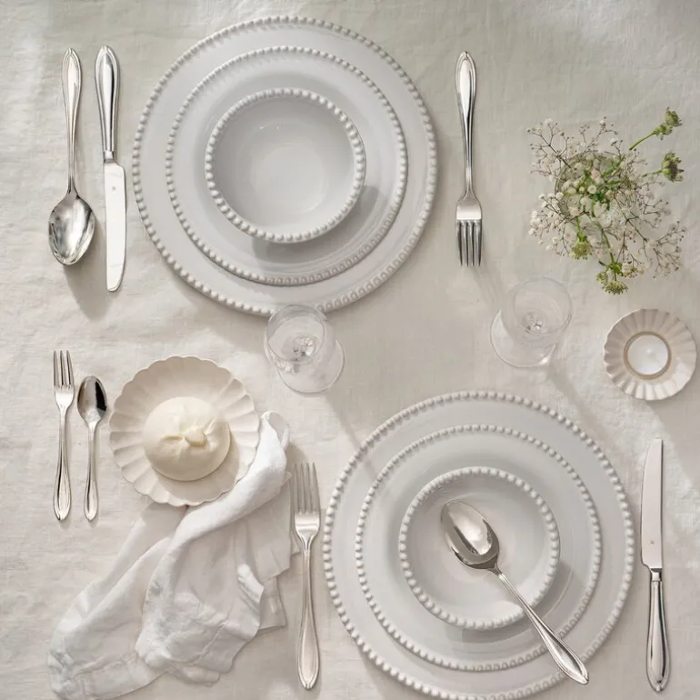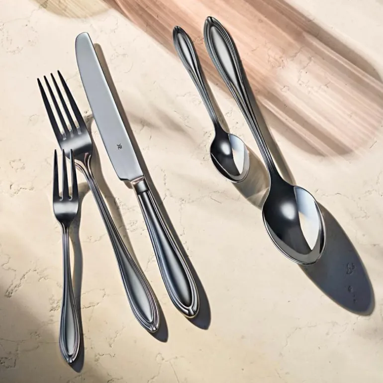 Klassisk design med et snev av romantikk: Bestikksett til 12 personer. Skap den perfekte spiseopplevelsen med dette flotte Verona-bestikket fra WMF, der det klassiske designet når helt nye høyder med de vakre, romantiske detaljene. Bestikket har et forførende design med en flott tråd hele veien rundt og brede former som skaper en vakker kontrast til den tilspissede enden på skaftet. Fremstilt i Cromargan® rustfritt stål 18/10 i høy kvalitet så bestikket holder år etter år. Og det utrolig flotte designet slår aldri feil.
