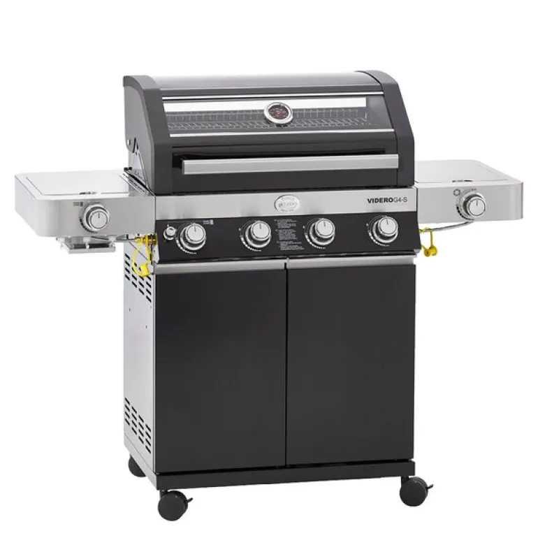 Rösle Videro G4-S gassgrill med mange funksjoner. Gassgrill med fire hovedbrennere av rustfritt stål (3,5 kW hver). Hovedgrillområde: 70 x 45 cm, oppvarmingsstativ: 70 x 16 cm. Solid grillrist av emaljert støpejern sørger for de klassiske grillmerkene.