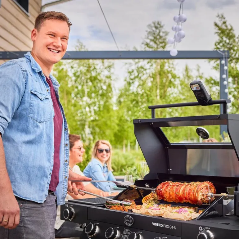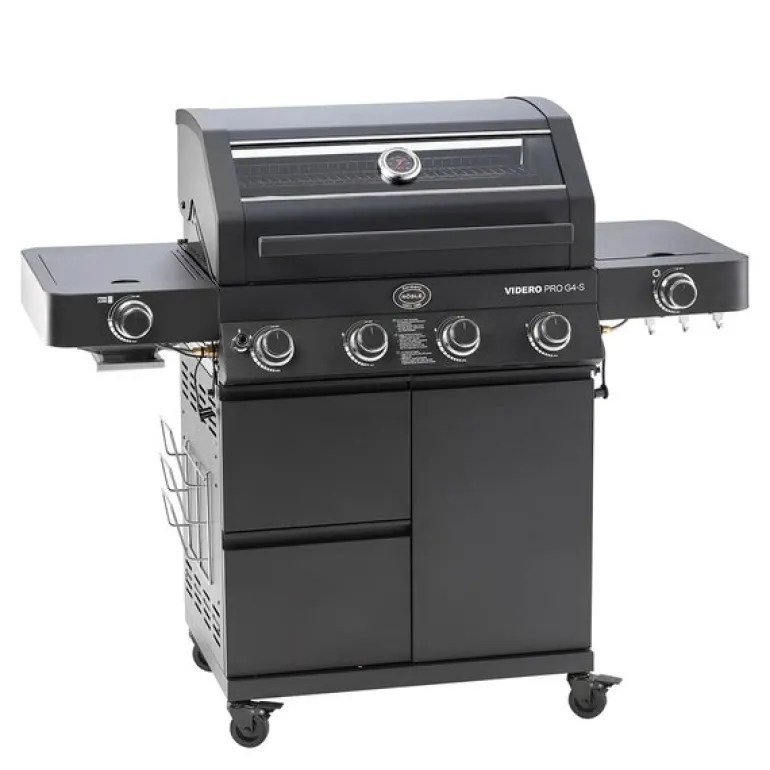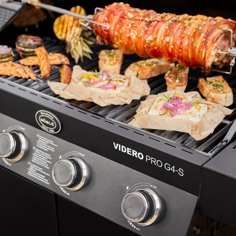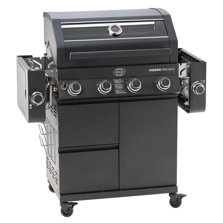 Rösle Videro Pro G4-S Vario+ gassgrill i svart er en funksjonsrik grill med høy ytelse og gjennomtenkt design. Grillen er utstyrt med fire hovedbrennere i rustfritt stål, hver på 3,5 kW, som gir god og jevn varmefordeling. Totaleffekten på 20500 watt sørger for effektiv grilling. Grillområdet måler 70 x 45 cm, og oppvarmingsstativet gir ekstra plass med sine 70 x 16 cm. Grillristene er laget av emaljert støpejern og gir tydelige og klassiske grillmerker.