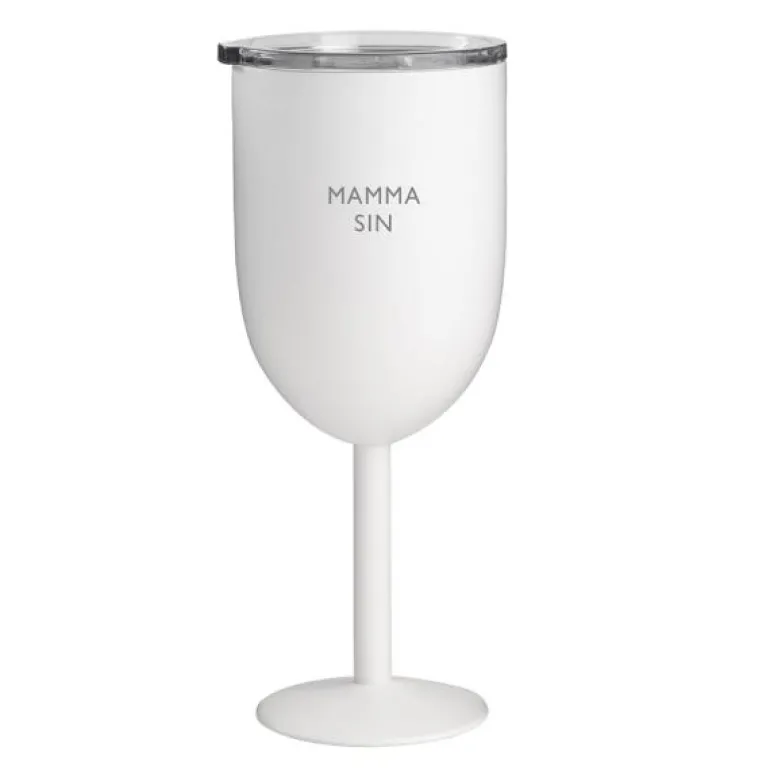 Vinglass termo MAMMA SIN 35 cl i hvit fra PictureIt er et godt valg for deg som ønsker å nyte kalde drikker med stil og komfort. Termoglasset, med doble vegger i rustfritt stål, holder drikken kald i lengre tid. Det praktiske lokket hindrer insekter fra å komme i drikken, noe som gjør glasset ideelt for utendørs bruk. Fargen sammen med sort tekst gir et moderne og elegant utseende.