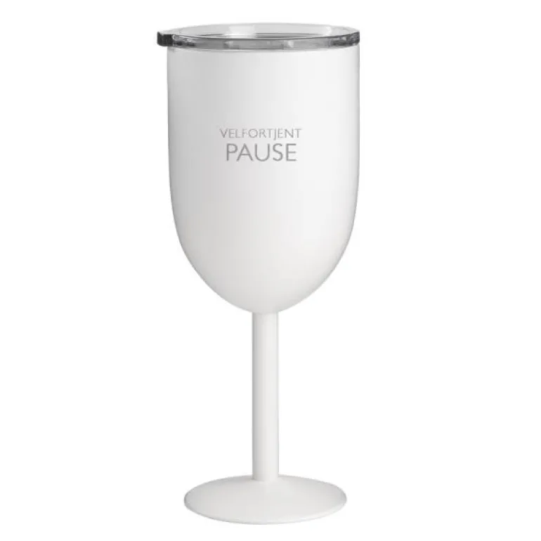 Vinglass termo VELFORTJENT PAUSE 35 cl i hvit fra PictureIt er et godt valg for deg som ønsker å nyte kalde drikker med stil og komfort. Termoglasset, med doble vegger i rustfritt stål, holder drikken kald i lengre tid. Det praktiske lokket hindrer insekter fra å komme i drikken, noe som gjør glasset ideelt for utendørs bruk. Fargen sammen med sort tekst gir et moderne og elegant utseende.