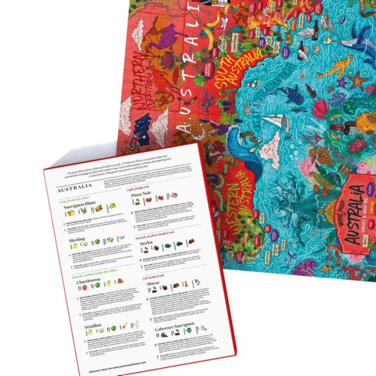 Nøye kuratert av vår egen sommelier, setter det australske vinpuslespillet fokus på landets fremste vinproduserende regioner og de viktigste druetyper. Puslespillboksen inneholder også våre drueprofiler og tips for matkombinasjoner! Vår design er håndtegnet og har gjennomgått en nøye gjennomgang med hjelp fra noen av verdens fremste sommelierer.