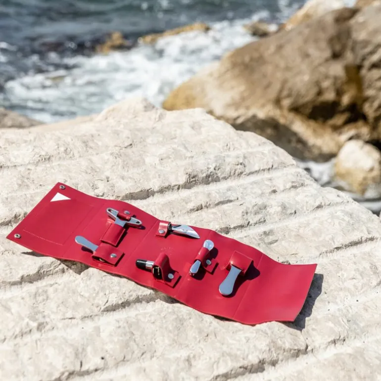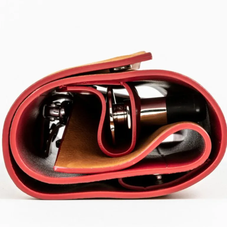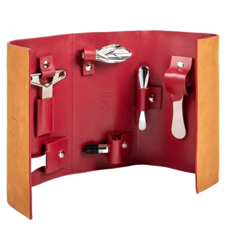 Vinredskapssett Oeno Collection Nomad fra Látelier Du Vin . Dette korketrekkersettet har alt du trenger for å nyte vinen eller champagnen din hjemme eller på farten, da det kommer pakket i en vakker lærveske, noe som gjør det til den perfekte følgesvenn for vinelskere. Hvert sett er helt unikt og håndlaget fra italiensk skinn.