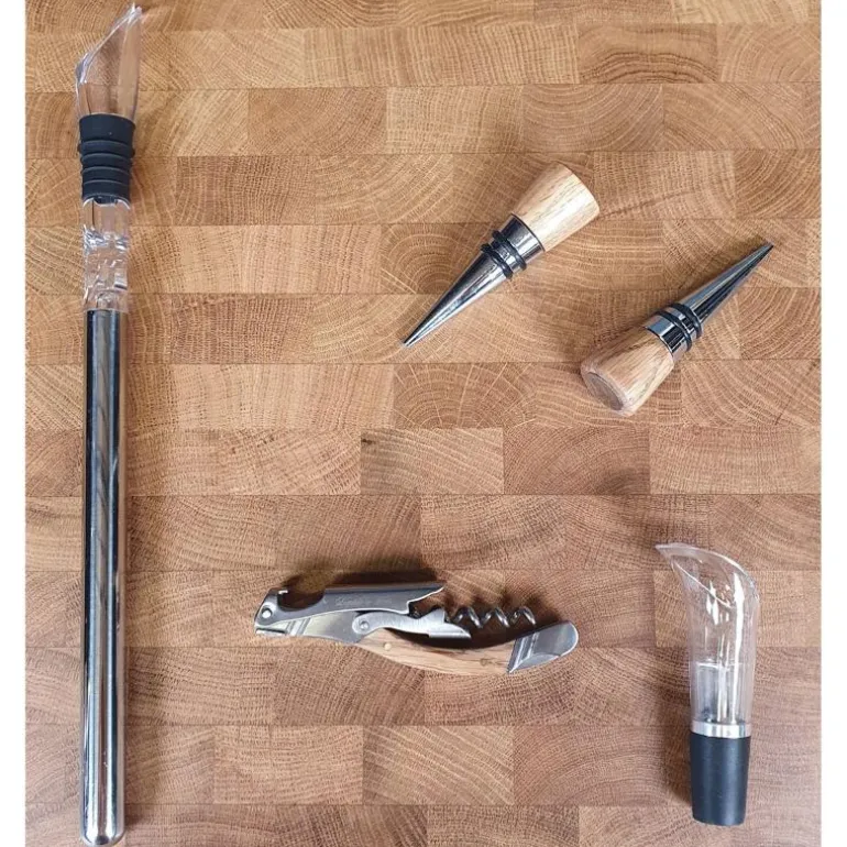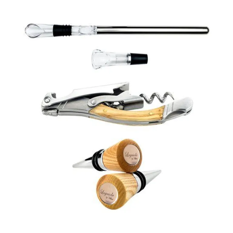 Korketrekkeren er laget av 420 rustfritt stål og merket med en logo med. Den har håndtak i oliventre.Esken inneholder:1 x korketrekker 2 x vinkorker1 x kylsticka med droppfri pip1 x droppfri pipSettet är förpackat i en snygg svart låda i trä