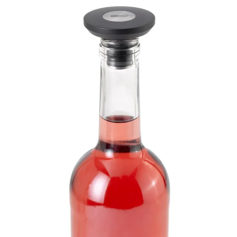 Vinstopper i silikon gjør flasken lufttett. Flat utforming som gjør den ideell for oppbevaring i kjøleskapsdøren. Laget i BAS og PC plast og 18/8 stål. Den er 5 cm i diameter og 3,5 cm høy. Kan rengjøres i oppvaskmaskin.