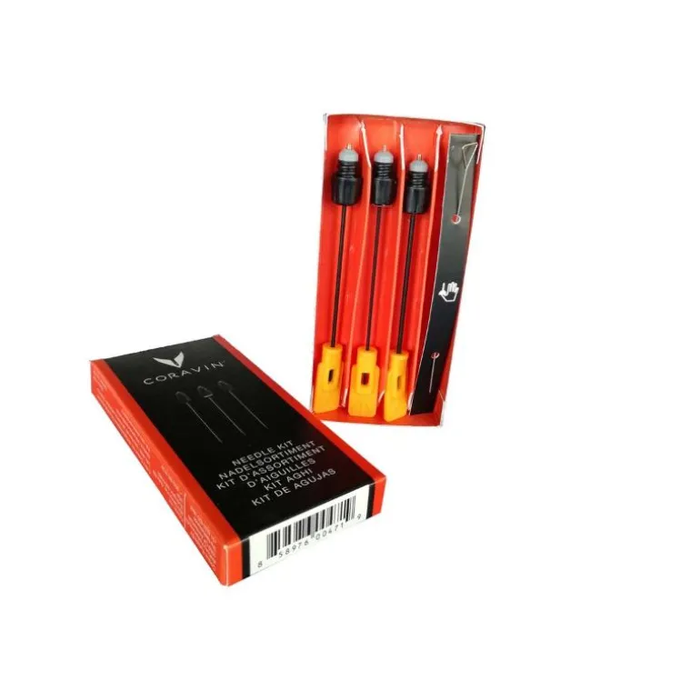 Coravin sett med tre nåler inneholder tre forskjellige Coravin vinsystemnåler, slik at du har en nål for enhver flaske eller situasjon. Alle Coravin vinsystemnåler er i rustfritt stål og belagt med Teflon+. Dette gjør dem slitesterke, og det er enkelt å sette dem inn for hundrevis av skjenkinger.