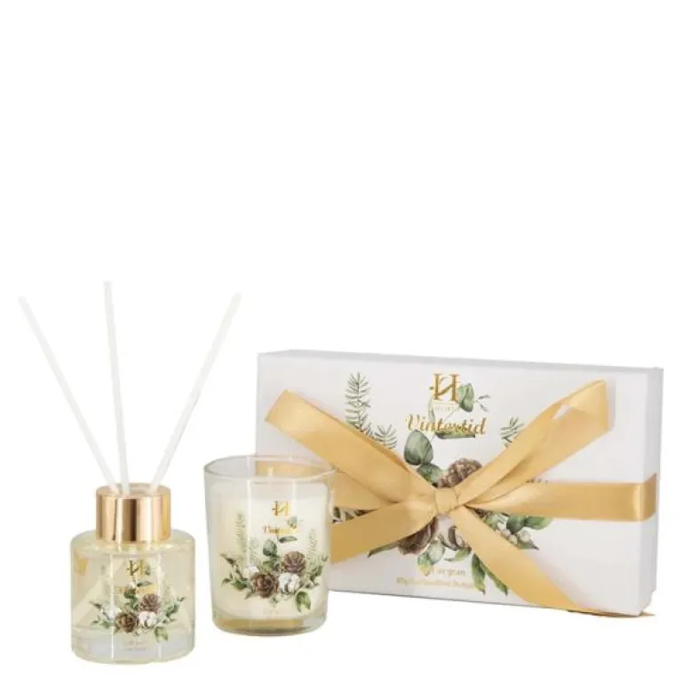 Gavesettet Vintertid fra Holmen består av duftpinner og duftlys, med en herlig duft av granbar som skaper en nydelig atmosfære og julestemning i hjemmet. Settet kommer i en fin gaveeske med sløyfe.