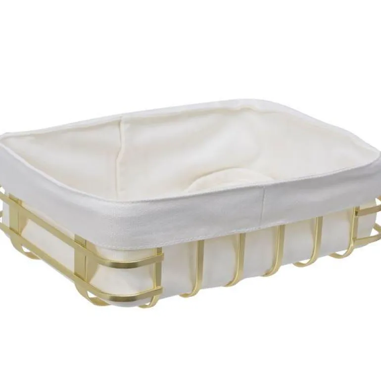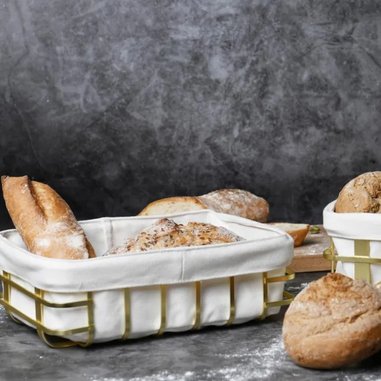 Server nystekte rundstykker eller annen gjærbakst i disse stilige brødkurvene. Tekstilposen er avtagbar og produsert av 100% bomull. Stålkurv belagt med en matt, gullfarget overflate.