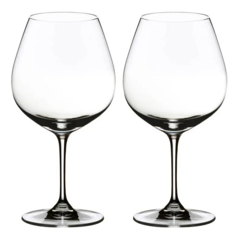 To stykk druespesifikke vinglass, Pinot Noir (Burgundy Red) fra Riedel Vinum. Dette glasset er en nødvendighet for den som elsker rød burgunder. Glasset løfter frem fruktsødmen i vinen og balanserer på den måte det høye syreinnholdet.