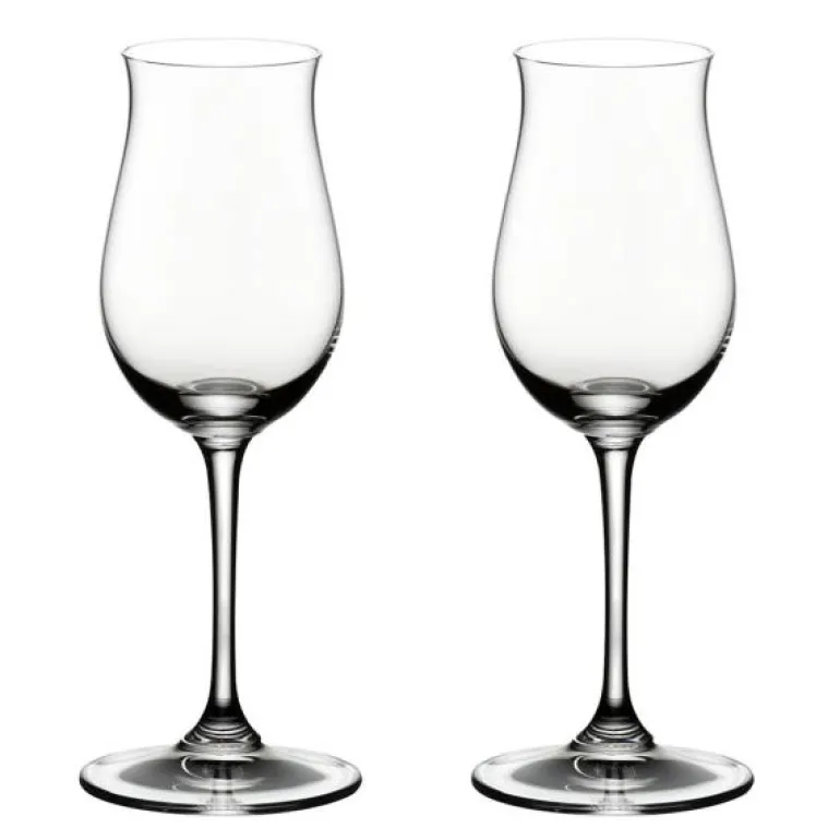 To stykk Cognacglass, Hennessy, fra Riedel Vinum. Konjakkglasset er laget spesielt for fatlagret brennevin med rund og myk karakter. Klokken hever opplevelsen av konjakk ved å dempe den sterke alkoholduften og i stedet la drikkens søte, komplekse aromaer tre frem.