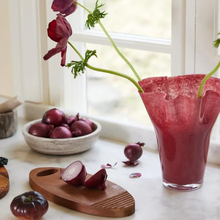 Som en nyutsprunget blomst folder den ut bladene. Vas viva flørter med oss på en forførende måte – de organiske formene og den diskrete vekten. Viva vase skiller seg ut som en statuett med og uten grønne blader og blomster. Viva vase stor i burgunder farget glass pryder ethvert vakkert bord og skaper umiddelbart en koselig atmosfære. En svensk original som har en åpenbar plass i ethvert hjem. Alle vasene er håndlagde og unike. Leveres i klassisk gaveeske. Designstudio Sagaform.