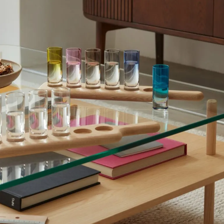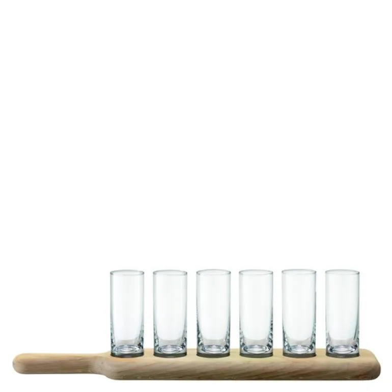 Dette settet fra LSA International består av seks klare shotglass plassert i fordypninger på et serveringsbrett laget av eik. En elegant og praktisk løsning for servering av vodka, tequila og andre typer brennevin.