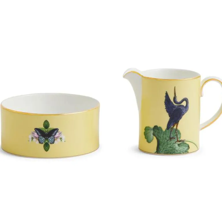 Waterlily sukker og fløtesett. Ønsk velkommen til en verden av farger med dette Wedgwood Waterlily sukker- og fløtesettet. Et mønster fra arkivet inspirert av Amazonas, nå med en oppdatering. Laget av vakkert benporselen med detaljer av 22 carat gull. En del av Wonderlust-samlingen.Håndvask anbefales.