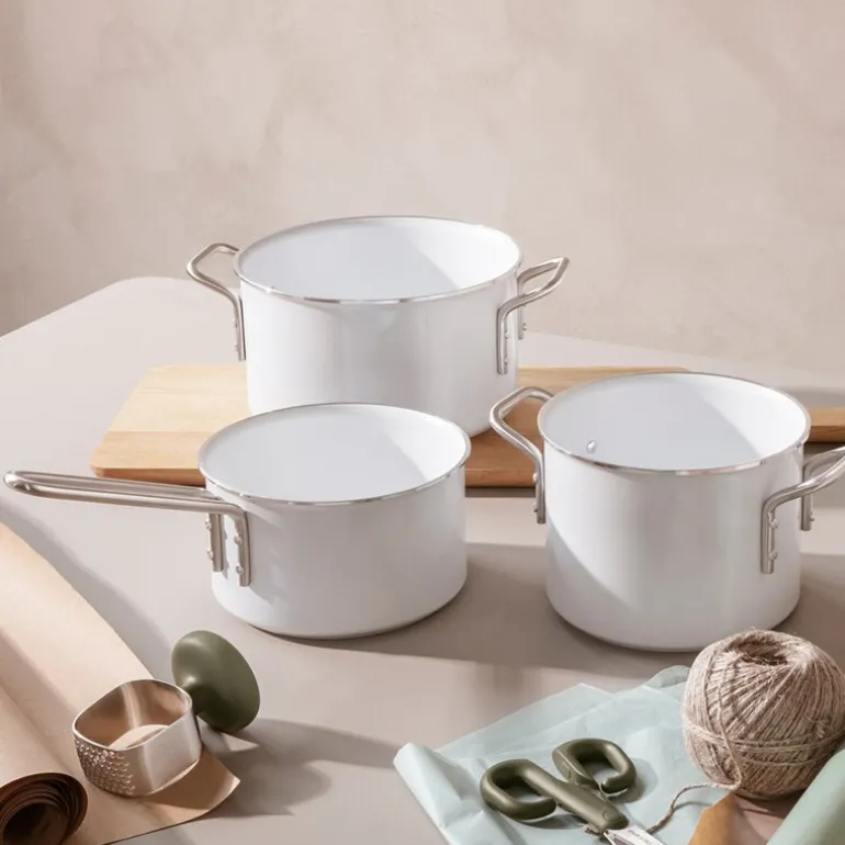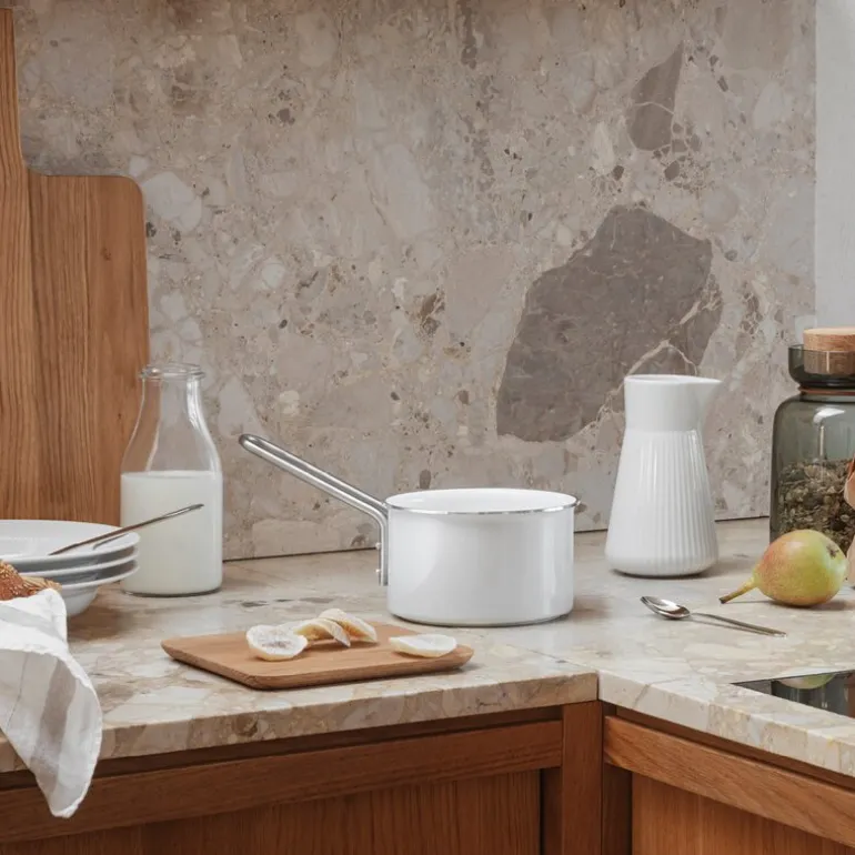 White Line kasserolle 1,1L keramisk Slip-Let® belegg fra Eva Trio. Kasserollen er perfekt for tilberedning av sauser og grøt, samt til å smelte smør og sjokolade. Kasserollen er lagd av 98 % resirkulert aluminium og er utstyrt med et keramisk Slip-Let®-belegg som effektivt forhindrer at mat setter seg fast og brenner seg, noe som gjør matlagingen og rengjøringen enklere.