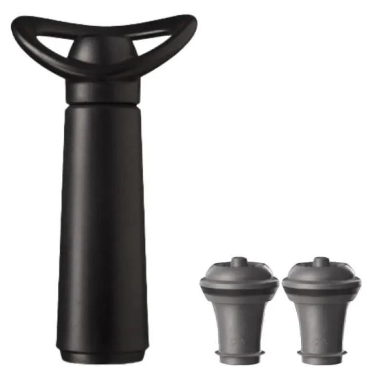 Vacu Vin’s Wine Saver Concerto kommer nå i en stilig svart gaveeske. Denne vinsparepumpen fjerner effektivt luften fra åpnede flasker og forsegler dem deretter med en gjenbrukbar gummipropp. Vakuumet bremser oksidasjonsprosessen og bidrar til å lagre vinen over lengre tid. For å bruke den, sett bare vakuumproppen i flasken og pump til du hører det tilfredsstillende «klikket».