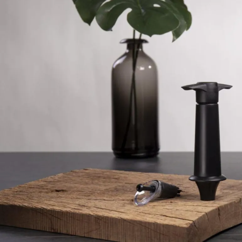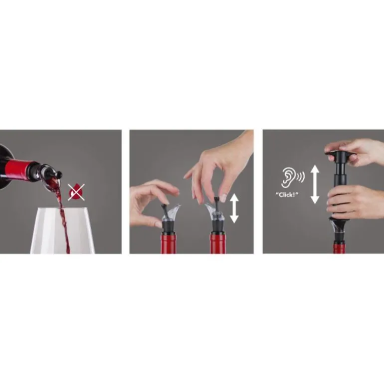 Wine Server & Saver fra Vacu Vin. Dette geniale produktet kombinerer vinsparing med patenterte serveringsfunksjoner. Ved å skape et vakuum, bremser det oksidasjonsprosessen og bevarer vinen over lengre tid. Når optimalt vakuum er oppnådd, vil det utløse et tydelig «klikk». Serveren og proppen fungerer som en forsegling og garanterer en dryppfri skjenking hver gang.