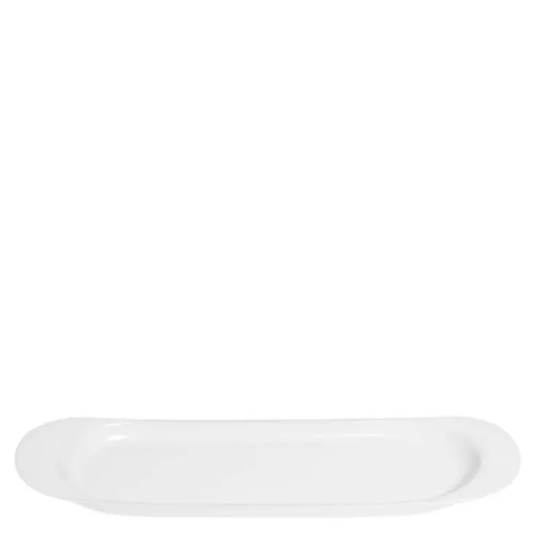 Hvitt serveringsfat 40 cm, Wing. På 1950-tallet produserte Kay Bojesen sin ikoniske fiskebrett i sølv, som senere ble introdusert i porselen. WING formspråket er identisk med originalen; lett og svevende, med fine buede kanter og avsluttende vinger som gjør den enkel og elegant. Wing har mange funksjoner, naturlig nok på kjøkkenet, på de dekkede bordene, men også rundt om i hjemmet; til smykker på nattbordet eller penner og mynter på skrivebordet.