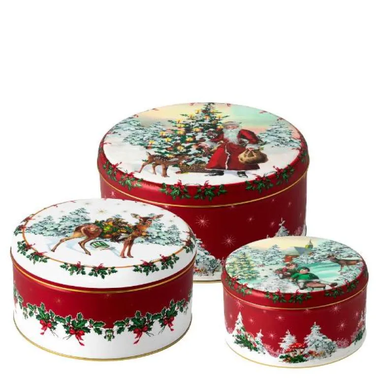 Winter Collage er en del i Villeroy & Bochs store juleverden. Serien består av lekfulle dekorasjoner. De tre vakkert dekorerte metallkassene er ideelle for oppbevaring av kjeks og andre småting. Når boksene ikke lenger er nødvendige, kan de stuves inne i hverandre for å spare plass. Laget i metall. 19,7×9,4cm. Tørk av med en fuktig klut.