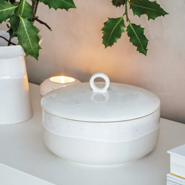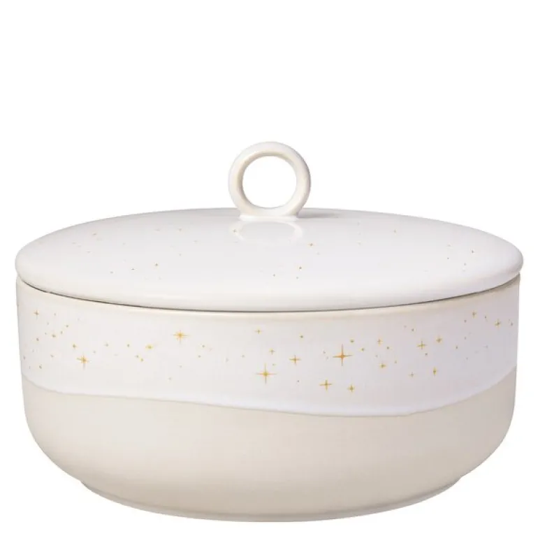 Winter Glow låg krukke 1,3L fra Villeroy & Boch er en elegant kakekrukke. Med sitt delikate stjernemotiv i skinnende effektglasur som minner om snø og glitrende iskrystaller, tilfører denne krukken et snev av vinterens magi til hjemmet ditt. Krukken er en del av Winter Glow-kolleksjonen, som er designet for å skape en koselig og varm atmosfære i den kalde årstiden. Med sin moderne og trendy utforming passer den perfekt til en skandinavisk vinterlook, og er like flott til oppbevaring av julekaker som til dekorasjon. Denne vakre kakekrukken er også en utmerket gave til noen som setter pris på stilige og praktiske interiørdetaljer.