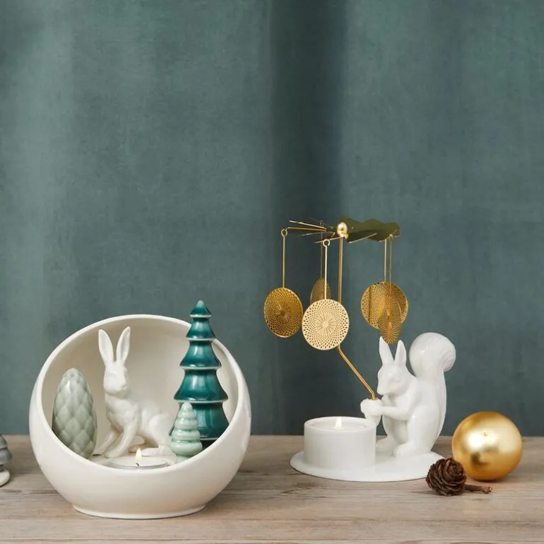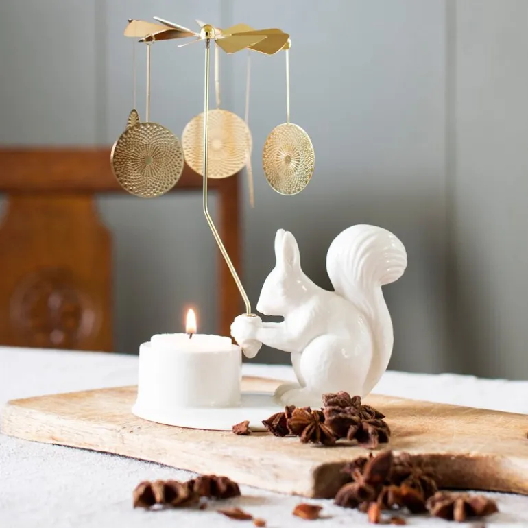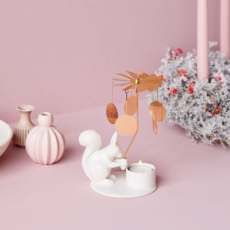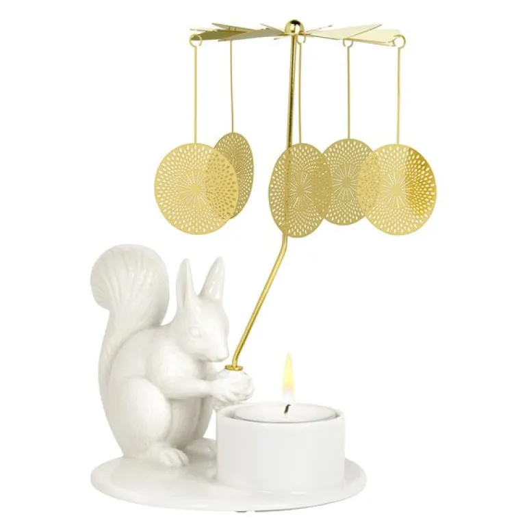 Winter Stories englespill Ekorn fra Dottir er en sjarmerende og leken pyntegjenstand som tilfører hjemmet ditt en magisk atmosfære. Designet av Thora Finnsdottir, viser dette vakre stykket et delikat keramisk ekorn som holder en gyllen klokke. Når telyset under tent, snurrer de gyldne skivene forsiktig og skaper dansende lysmønstre som sprer seg rundt i rommet, og tilfører en rolig og fascinerende glød til vinterkveldene.