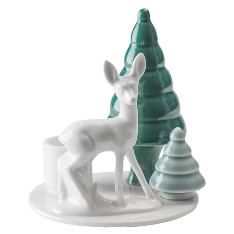 Winter Stories lysestake Bambi fra Dottir gir vinterbordet ditt et magisk og personlig preg. Designet av Thora Finnsdottir, viser denne sjarmerende lysestaken en grasiøs keramikkfawn som står blant to skulpturerte trær, og fanger den fredelige skjønnheten av en vinterlig skog. Med detaljerte trekk på fawnen og trær i myke grønntoner, bringer lysestaken en følelse av naturens stille ro til rommet, perfekt for den kalde årstiden.