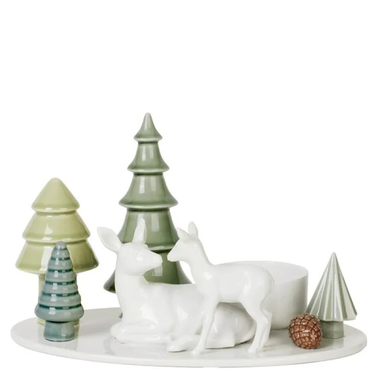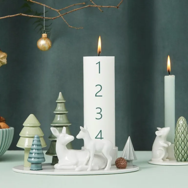 Lysestaken er designet for 6 cm stearinlys, men fungerer også godt med 5 cm lys, som gir et mykt lys over hjorten og dens omgivelser, og fremhever de nydelige detaljene i dette håndlagde keramiske stykket. Med målene 143 x 235 mm er den stor nok til å fungere som et midtpunkt på feriebordet, peishyllen eller som en del av vinterdekorasjonen din.