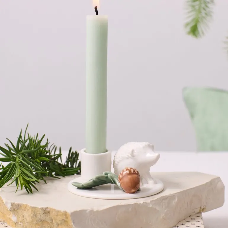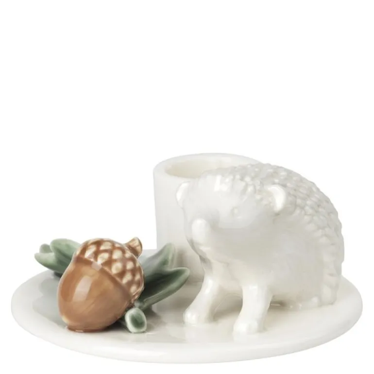 Winter Stories lysestake Pinnsvin fra Dottir er et sjarmerende innslag til vinterens dekor som tilfører en lun og magisk stemning til hjemmet ditt. Designet av Charlotte Adrian, fremhever denne lysestaken et delikat porselenspinnsvin som beveger seg blant eikenøtter og eikeblader, og skaper en hyggelig atmosfære inspirert av skogens ro. Med en diameter på 9,5 cm og en høyde på 4,8 cm er lysestaken ideell for 22 mm lys, og gir et mykt og mildt lys som lyser opp i vintermørket.
