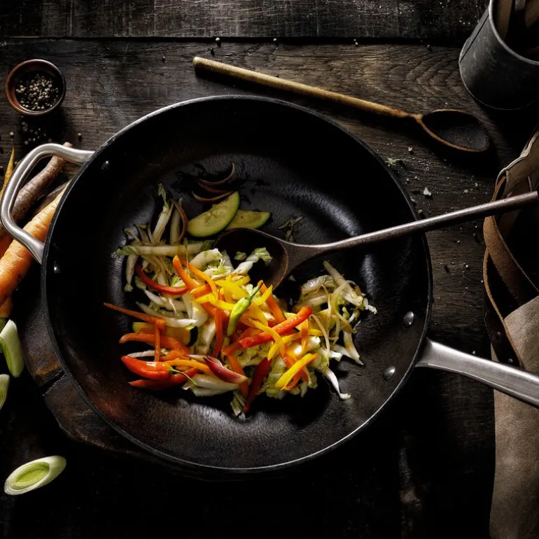 Skottsbergs wokpanne i støpejern er utviklet for å levere både kraft og kontroll på kjøkkenet. Med sin 34 cm diameter og ferdig innbrente overflate med vegetabilsk olje, er den klar for bruk rett ut av esken. Wokpannen er laget i én solid støping og gir jevn og rask oppvarming.