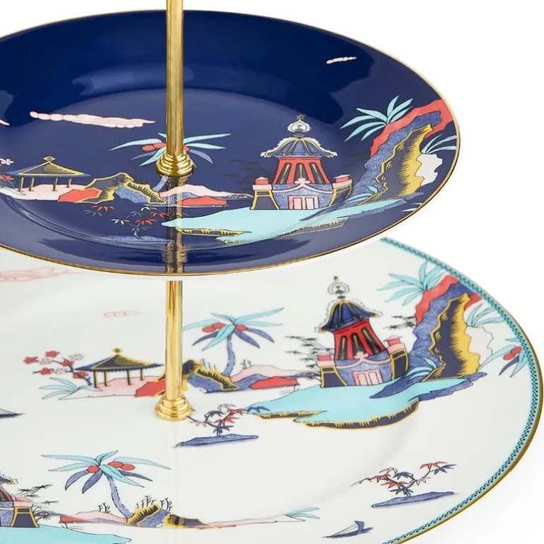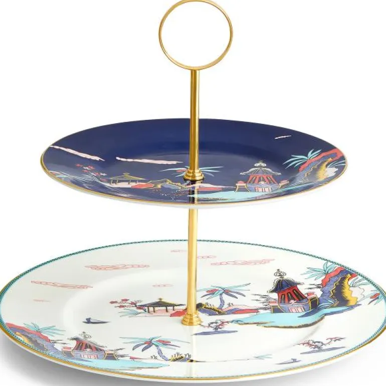 Wonderlust 2 Tier cake stand. Ta en reise rundt i verden med Wonderlust-kolleksjonen, en eklektisk samling av mønstrede skåler, krus, middagstallerkener, duftlys, bilderammer og mer, alt inspirert av underverkene ved å reise fra Europa til Asia. Her vil du avdekke fargerike, eklektiske design inspirert av den eksepsjonelle skjønnheten til eksotiske blomster og planter fra de forskjellige kontinentene.Alle delene presenteres i vakre Wedgwood-blå gaveesker som er klare for å feire alle livets spesielle øyeblikk.