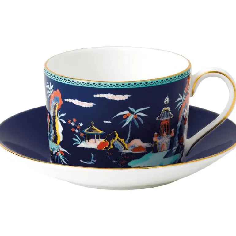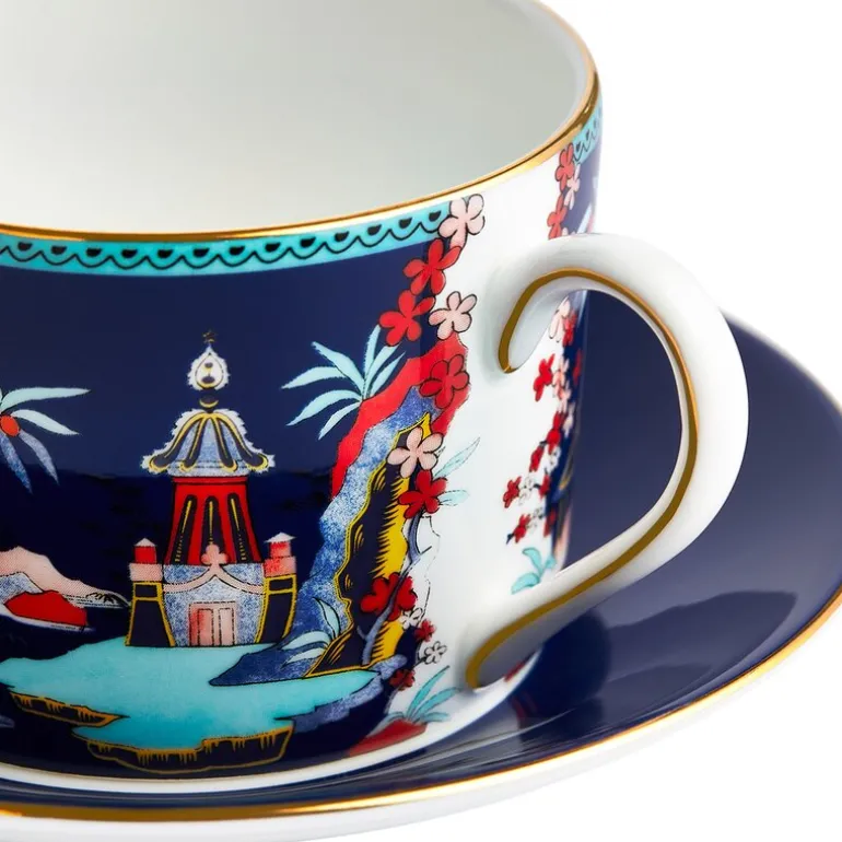 Wonderlust Blue Pagoda Tcup/Scr BXD. Ta en reise rundt i verden med Wonderlust-kolleksjonen, en eklektisk samling av mønstrede skåler, krus, middagstallerkener, duftlys, bilderammer og mer, alt inspirert av underverkene ved å reise fra Europa til Asia. Her vil du avdekke fargerike, eklektiske design inspirert av den eksepsjonelle skjønnheten til eksotiske blomster og planter fra de forskjellige kontinentene.Alle delene presenteres i vakre Wedgwood-blå gaveesker som er klare for å feire alle livets spesielle øyeblikk.