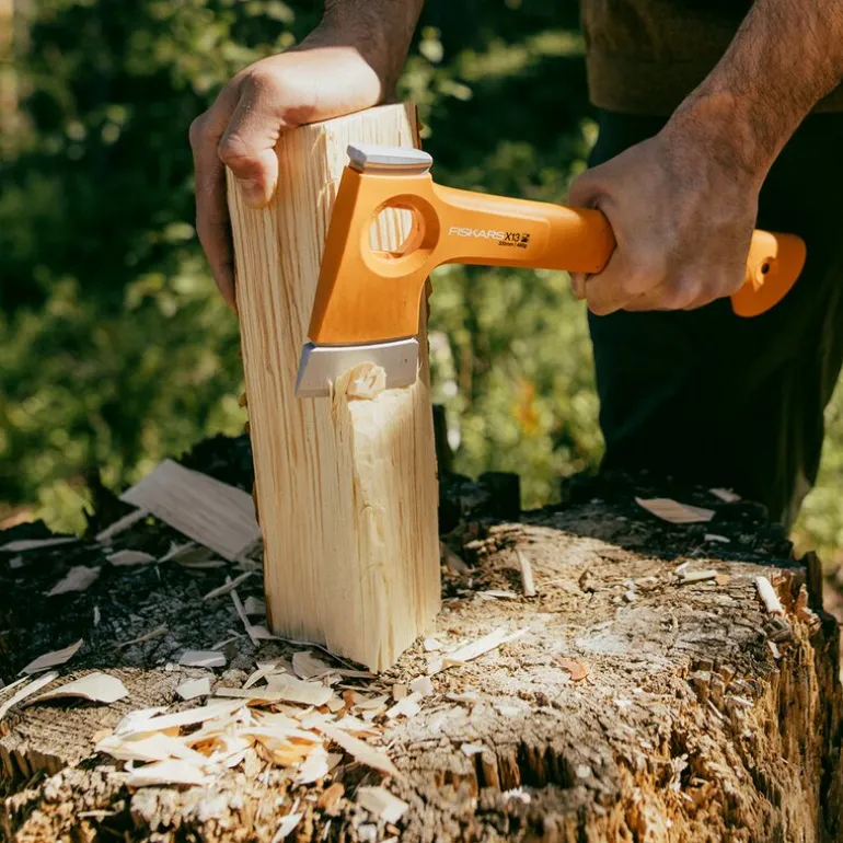 X-series™ X13 ultralett turøks 33,5 cm oransje. Fiskars X13 ultralett jakt- og fritidsøks er perfekt til å hugge ved og til andre gjøremål på campingplassen. Et nytt og optimalisert design gjør øksen 15 % lettere enn andre kompakte økser i X-serien™. Fiskars egen sliping gir et blad med skarpere egg og helt overlegen kontakt med rene kutt.