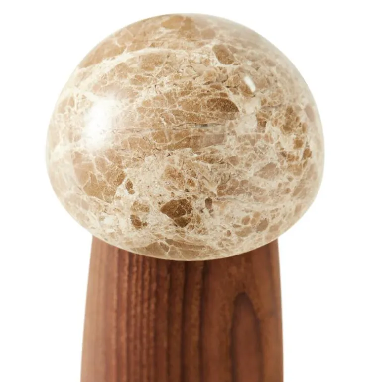 Den lyse marmoren skaper en vakker kontrast til det mørke treet, som setter en spiss på designet.
